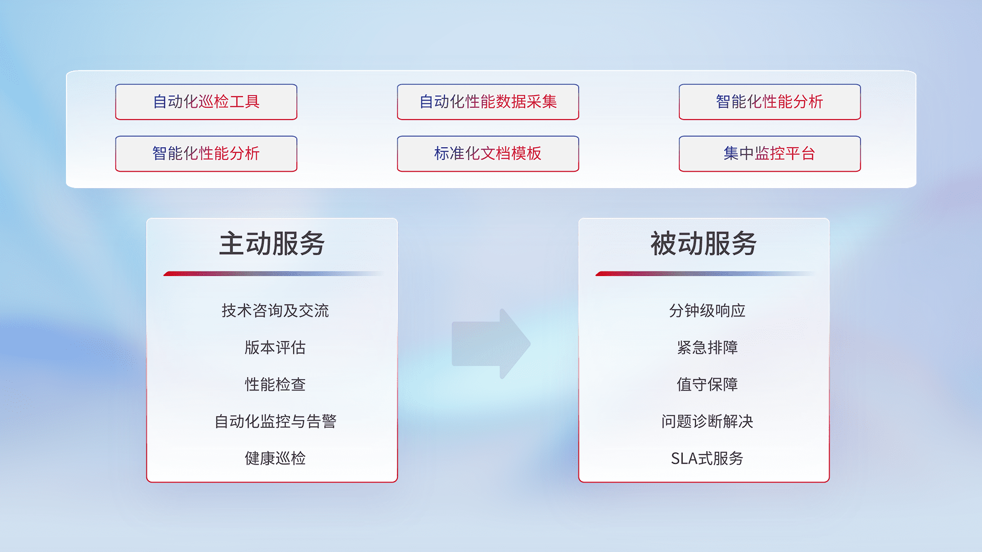 智能化工具和标准化文档,,,,保障服务质量,,,提供主动服务(包含技术咨询、、、、版本评估、、性能检查、、自动化监控与告警、、健康巡检)和被动服务包含(分钟级响应、、紧急排障、、、值守保障、、、问题诊断解决、、、、SLA服务)。。。。