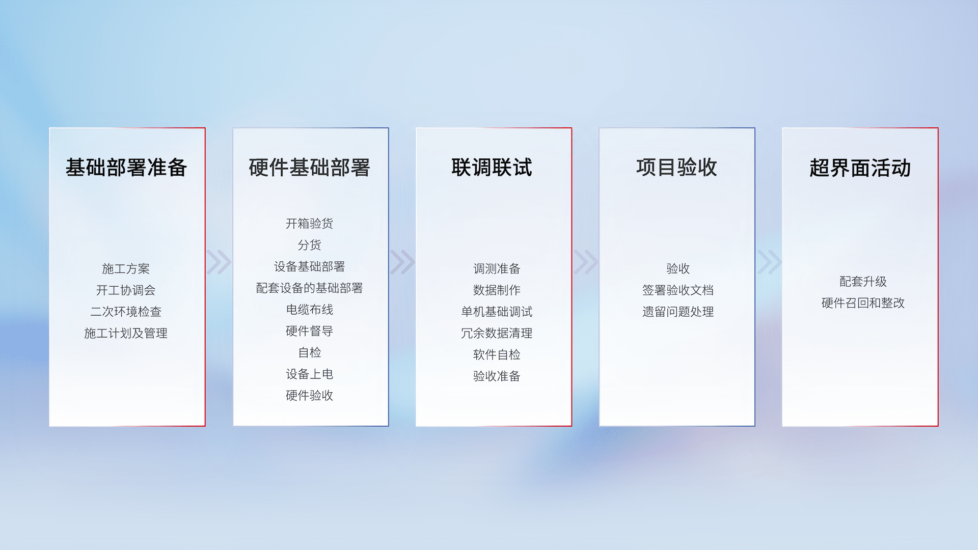 从基础部署准备、、硬件基础部署、、、、联调联试、、、、项目验收、、、、越界面活动的全过程可追溯,,保证施工质量和进度。。。。